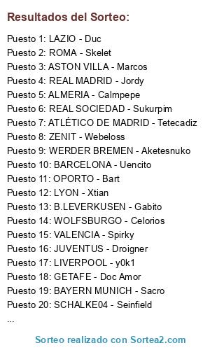 Lista de participantes: BARCELONA - Uencito, REAL MADRID - Jordy, CHELSEA - Jumi Mario, MANCHESTER CITY - Ayo, MANCHESTER UNITED - Carbel, ARSENAL - Carlossocio, INTER - Ace, ATLÉTICO DE MADRID - Tetecadiz, MILAN - Icaropub, LIVERPOOL - y0k1, BAYERN MUNICH - Sacro, TOTTENHAM - Carkill, ROMA - Skelet, JUVENTUS - Droigner, LYON - Xtian, SEVILLA - KloN, VALENCIA - Spirky, ZENIT - Webeloss, HERCULES - Primito, ALMERIA - Calmpepe, OPORTO - Bart, VILLAREAL - Rakaldas, O.MARSEILLE - Nesjai, WOLFSBURGO - Celorios, LAZIO - Duc, REAL SOCIEDAD - Sukurpim, ASTON VILLA - Marcos, EVERTON - EVL JJ, B.LEVERKUSEN - Gabito, GETAFE - Doc Amor, SCHALKE04 - Seinfield, WERDER BREMEN - Aketesnuko.