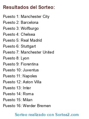 Lista de participantes: Barcelona, Wolfburgo, Real Madrid, Roma, Werder Bremen, Manchester United, Manchester City, Stuttgart, Juventus, Inter, Milan, Aston Villa, Chelsea, Lyon, Napoles, Fiorentina.
