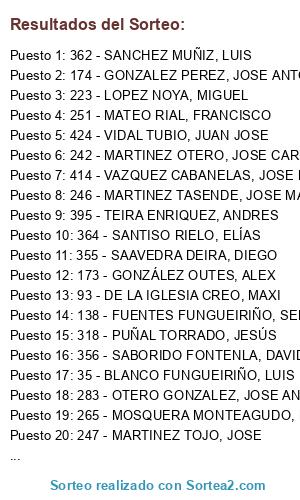 Lista de participantes: 1 - ABADIN, ALVARO, 2 - ABADIN, JOSE LUIS, 3 - ABEIJON GOMES, AGOSTIÑO, 4 - ABEIJON GONZALEZ, DAVID, 5 - AGEITOS, ISMA, 6 - AGRAFOJO PEREIRA, RAFA, 7 - AGRASO TORRES, ALFONSO, 8 - AGUEDO MOSQUERA, JOSE MARIA, 9 - ALCALDE GARCIA, JUAN JAVIER, 10 - ALONSO ALONSO, MARCOS, 11 - ALONSO DOMÍNGUEZ, ROBERTO, 12 - AMADOR SOUTO, MIGUEL, 13 - AMBROA VILAS, EUGENIO, 14 - AMENEIRO MARTINEZ, VICTOR MANUEL, 15 - AMONDARAIN MARTINEZ, DANIEL, 16 - ANTELO MARTÍNEZ, JOSÉ RAMÓN, 17 - ARES ABALO, JOSE MARIA, 18 - ARUFE FERNÁNDEZ, IVÁN, 19 - ARUFE SANTAMARIA, JUAN, 20 - BAHILLO GREGORIO, AITOR, 21 - BAHILLO GREGORIO, RUBEN, 22 - BARANDELA SANDIANES, DANIEL, 23 - BARREIRO BRANDON, DAVID, 24 - BARREIRO MOAS, ANGEL, 25 - BARREIRO RODRIGUEZ, OSCAR, 26 - BARREIRO ROMAY, ROBERTO CARLOS, 27 - BARROS GARCIA, DIEGO, 28 - BEIS SANCHEZ, CARLOS, 29 - BELLO CASTRO, JOSÉ ANTONIO, 30 - BEN-HAKIM PARDIÑAS, YASMINA, 31 - BERIAS LAIÑO, LUIS, 32 - BERMUDEZ ALCALDE, IVÁN JOSÉ, 33 - BLANCO CALO, PABLO, 35 - BLANCO FUNGUEIRIÑO, LUIS, 36 - BLANCO OTERO, RAMON, 37 - BLANCO VILARIÑO, DIEGO, 38 - BOO BUENO, ENRIQUE, 39 - BOO MUNIN, DAVID, 40 - BOQUETE GARCIA, IGNACIO, 41 - BOTANA BALO, FERNANDO, 42 - BOUZAS, ADRIAN, 43 - BOUZAS GORGAL, MANUEL, 44 - BREA REGUEIRA, ANDRÉS, 45 - BRION TUBIO, CARLOS, 46 - BUJAN, ANGEL, 47 - BUJAN SANTOS, EDUARDO, 48 - CAAMAÑO CAAMAÑO, MOISES, 49 - CAAMAÑO NIETO, AVELINO, 50 - CAAMAÑO NIETO, RUBEN, 51 - CAAMAÑO SESTAYO, SANTIAGO, 52 - CADILLA DOMINGUEZ, ANTONIO, 53 - CALO ARAN, JOSE, 54 - CALO VICENTE, JUAN MANUEL, 55 - CALVIÑO CARREÑO, JOSE, 56 - CALVO CURRÁS, MON, 57 - CALVO GARCÍA, TARSI, 58 - CALVO QUINTANS, J. MANUEL, 59 - CALVO REY, IVAN, 60 - CAMEAN CAMEAN, JOSÉ FRANCISCO, 61 - CAMIÑO FRAMIL, JOSE ANTONIO, 62 - CAMPOS MARTINEZ, JOSE, 63 - CAMPOS VILLAVERDE, ÁLVARO, 64 - CANDA RAMOS, OSCAR, 65 - CANLE REINO, JOSÉ IVÁN, 66 - CANOSA DOMINGUEZ, DANI, 67 - CARBALLAL IGLESIAS, ALBERT, 68 - CARBALLEIRO VILAR, JESUS, 69 - CARBALLIDO SALGAOD, JORGE, 70 - CAROU FERNANDEZ, JOSE RAMON, 71 - CAROU HORTA, JUAN, 72 - CARRACEDO LAMAS, RODRI, 73 - CARRO CES, RUBÉN, 74 - CASANOVA GONZÁLEZ, DIEGO, 75 - CASCALLAR VAZQUEZ, JAVIER, 76 - CASTIÑEIRAS MONDRAGÓN, RUBÉN, 77 - CASTREJE CANOSA, JESUS MANUEL, 78 - CASTRO RODRIGUEZ, JOSE LUIS, 79 - CASTRO RODRIGUEZ, ROBERTO CARLOS, 80 - CELA YAGUE, JORGE, 81 - CERNADAS ALLEGUE, ISIDRO, 82 - CHOREN MAGARIÑOS, ALBERTO, 83 - CORRALES, JOSE ANTONIO, 84 - COSTA FERNANDEZ, DAVID, 85 - COSTA FERNÁNDEZ, MIMIN, 86 - COSTA MONTES, MARTIN, 87 - COSTA VAZQUEZ, JESUS, 88 - COSTOYA RODRÍGUEZ, SERGIO, 89 - COTELO LISTA, MANUEL, 90 - COUTO LOSADA, ALBERTO, 91 - CUETO CUIÑAS, FERNANDO, 92 - DANS PAZ, DIEGO ENRIQUE, 93 - DE LA IGLESIA CREO, MAXI, 94 - DIAZ GUTIERREZ, VALENTIN, 95 - DOMINGUEZ FERREIRA, JOSE LUIS, 96 - DOMINGUEZ GALBAN, PAULO, 97 - DOMINGUEZ NUÑEZ, XOSE MARIA, 98 - DOMINGUEZ RECAREY, FRANCISCO MANUEL, 99 - DOPAZO MELLA, JOSÉ MANUEL, 100 - DOPAZO MENO, ANGEL, 101 - DOPORTO FERNÁNDEZ, JOSÉ MANUEL, 102 - EIRÍS ESPAÑA, CARLOS, 103 - ENRIQUEZ GARCIA, JOSE LINO, 104 - ESMORÍS CASTIÑEIRAS, RAUL, 105 - ESTÉVEZ AGRAFOXO, ÁLVARO, 106 - FABEIRO FIGUEROA, DAVID, 107 - FANDIÑO SANTOS, JORGE, 108 - FERNANDEZ ANTELO, FRANCISCO, 109 - FERNANDEZ BREA, ELOY, 110 - FERNANDEZ FERNANDEZ, FERNANDO, 111 - FERNÁNDEZ FORNÍS, DAVID, 112 - FERNÁNDEZ LOJO, AMADOR, 113 - FERNANDEZ PAZOS, DIEGO, 114 - FERNÁNDEZ POSE, JOSÉ MANUEL, 115 - FERNÁNDEZ REGO, DAVID, 116 - FERNANDEZ REY, DESIREE, 117 - FERRADAS LADO, IVAN, 118 - FERREIRA COUSELO, JOSE CARLOS, 119 - FERREIRO FERNANDEZ, ARTURO, 120 - FERREIRO IGLESIAS, JUAN JOSE, 121 - FERREIRO MOLEDO, FRANCISCO, 122 - FERRERO QUIÑOY, DAVID, 123 - FIGUEIRA HERBÓN, FRANCISCO, 124 - FIGUEIRA VICENTE, MARCOS, 125 - FIGUEIRAS RODRÍGUEZ, MANUEL, 126 - FIGUEIRO, JOSE RAMON, 127 - FILGUEIRA PEDROSA, LUIS MANUEL, 128 - FONTAIÑA LAMAS, DAVID, 129 - FONTAIÑA RODRIGUEZ, JOSE RAMON, 130 - FONTENLA LOPEZ, ÁLVARO, 131 - FRAGA MARTÍNEZ, ALEJANDRO, 132 - FRAGIO SOUTO, PABLO, 133 - FRANCO AREVALO, MIGUEL ANGEL, 134 - FRANCO MATA, DAVID, 135 - FREIRE LEIS, ROBERTO, 136 - FREIRE LISTA, JOSE MIGUEL, 137 - FRESCO IGLESIAS, JOSÉ MARÍA, 138 - FUENTES FUNGUEIRIÑO, SERGIO, 139 - GALLARDO BLANCO, SERGIO, 140 - GAMALLO SÁNCHEZ, MANUEL, 141 - GÁNDARA LEMA, PERFECTO, 142 - GANDARELA FDEZ, JAVI, 143 - GARCÍA CARUNCHO, JOSÉ ANTONIO, 144 - GARCIA CASTAÑO, DANIEL, 145 - GARCÍA FERRO, CHEMA, 146 - GARCIA GARCIA, FERNANDO, 147 - GARCÍA GESTO, JOSÉ, 148 - GARCÍA MARIÑO, MANUEL, 149 - GARCIA MARTINEZ, HUGO, 150 - GARCIA PEREZ, JOAQUÍN, 151 - GARCÍA PINAL, ANÍBAL, 152 - GARCIA POMBO, J. MANUEL, 153 - GARCIA RODRIGUEZ, FERNANDO, 154 - GARCÍA ROMERO, JOSÉ MANUEL, 155 - GIMÉNEZ CASTRO, JOSÉ ANTONIO, 156 - GOMEZ, ANAEL, 157 - GOMEZ BREA, JUAN CARLOS, 158 - GOMEZ CALVIÑO, EMILIO, 159 - GOMEZ DOMÍNGUEZ, CARLOS, 160 - GOMEZ GOMEZ, FRANCISCO JAVIER, 161 - GÓMEZ MATO, MARCO ANTONIO, 162 - GÓMEZ RÍOS, JOSÉ ANTONIO, 163 - GÓMEZ RODRÍGUEZ, JOSÉ LUIS, 164 - GOMEZ SANTOS, JUAN, 165 - GONZÁLEZ CANLE, JOSÉ MANUEL, 166 - GONZALEZ DOMINGUEZ, FCO JAVIER, 167 - GONZALEZ DOMINGUEZ, MARCOS, 168 - GONZÁLEZ LAIÑO, RAMÓN, 169 - GONZALEZ LAMPON, SERGIO, 170 - GONZÁLEZ LORENZO, JUAN JESÚS, 171 - GONZALEZ LORENZO, MARCOS, 172 - GONZALEZ MARTINEZ, CARLOS, 173 - GONZÁLEZ OUTES, ALEX, 174 - GONZALEZ PEREZ, JOSE ANTONIO, 175 - GRARCIA PEREZ, VÍCTOR MANUEL, 176 - GRILLE SUÁREZ, JESÚS MANUEL, 177 - GUERRA BLANCO, TITO, 178 - GUILLÍN GÓMEZ, OSVALDO, 179 - GUTIERREZ SANCHEZ, ALBERTO, 180 - GUTIERREZ VIDAL, MARCOS, 181 - HERMO FERNANDEZ, DIEGO, 182 - HERMO MUÑIZ, ANTONIO, 183 - HERRAEZ GONZALEZ, DANIEL, 184 - HORTAS SOUTO, OSCAR, 185 - IGLESIAS, MIGUEL, 186 - IGLESIAS ARNEJO, JOSE, 187 - IGLESIAS GRAÍÑO, MANUEL, 188 - IGLESIAS MOSQUERA, FRANCISCO JAVIER, 189 - IGLESIAS VAZQUEZ, MIRIAN, 190 - INSUA, SANTOS, 191 - INSUA LEMA, RODRIGO, 192 - IRAGO RODRIGUEZ, DANIEL MANUEL, 193 - JAMARDO QUINTANS, ALBERTO, 194 - JUANATEY 