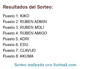 Lista de participantes: AKUMA, RUBEN MOLI, RUBEN AMIGO, EDU, KIKO, RUBEN ADMIN, CLAVIJO, ADRI.