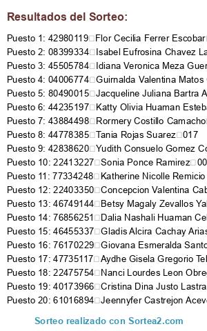 Lista de participantes: 40344560 Abad Rojas Palacios 008, 44215019 Amarut Amarilis Maylle Mendoza 017, 46862418 Ana Jackeline Avelino Velasquez 002, 44307917 Ana Maria Sanchez Gallardo 001, 71382225 Anaika Flores Pino 011, 70800914 Anmd Jagger Kesvy Hurtado Pimentel 013, 40415342 Armin Laurencio Dionisio 017, 47735117 Aydhe Gisela Gregorio Tello 002, 40636194 Bersely Guerrero Flores 019, 46749144 Betsy Magaly Zevallos Yalico 002, 40214219 Brid Belen Capcha Villegas 008, 41525657 Carmen Jossy Philco Bailon 014, 22518924 Carmen Rosa Miranda Gonzalez 013, 22487280 Carmen Ynes Sheffer Huaman 014, 22495315 Cesar Kid Figueroa Ortiz 013, 71931951 Cesia Nathaly Meza Guerra 003, 73596078 Charli Javier Martel Enrique 001, 22403350 Concepcion Valentina Cabanillas Malpartida 013, 72513181 Cristina Del Pilar Reynoso Ramon 017, 40173966 Cristina Dina Justo Lastra 008, 76856251 Dalia Nashali Huaman Celis 002, 22511188 Delia Cristina Munguia Agui 006, 44373000 Domitila Zevallos Yalico 002, 22418332 Elisa Del Pilar Taboada Bolarte 008, 42980119 Flor Cecilia Ferrer Escobar 014, 22503135 Frida Veronica Marrujo Orbezo 006, 76170229 Giovana Esmeralda Santos Castaneda 013, 46455337 Gladis Alcira Cachay Arias 002, 22421213 Gudelia Suarez Rodriguez 006, 04006774 Guirnalda Valentina Matos Gonzales 014, 71305891 Hany Abigail Sanchez Celis 010, 22425340 Hilda Sara Santos Espinoza 006, 22400591 Hortencia Zevallos Garcia 001, 45505784 Idiana Veronica Meza Guerra 003, 08399334 Isabel Eufrosina Chavez Lagos 002, 22501116 Ismildizina Margot Nesterenko Rojas 006, 22407371 Ivonne Maritza Ramirez Claud 008, 80490015 Jacqueline Juliana Bartra Alvarado 001, 74083346 Jazmin Kimberly Romero Cori 014, 61016894 Jeennyfer Castrejon Acevedo 013, 48081100 Jessica Victoria Robles Liberato 013, 80109952 Jhon Samuel Ortega Saturno 002, 73623171 Jose Feliciano Lugar Vilchez 002, 70679969 Karla Nalvarte Salazar 013, 76932762 Katerina Milagros Robles Pulido 008, 77334248 Katherine Nicolle Remicio Berrospi 006, 44235197 Katty Olivia Huaman Esteban 005, 44959954 Keila Guisela Acosta Ramos 008, 47268584 Ketty Janet Trujillo Bravo 002, 41055396 Laura Villar Huaynate 013, 46539481 Liz Andrea Montesinos Lugo 002, 42815965 Luce Maybe Ortiz Olaza 003, 22477567 Lucia Del Rosario Mory Vara 011, 41528194 Lucy Isidro Encarnacion 013, 71986792 Lucy Tania Chavez Garcia 013, 41637511 Luz Clarivel Tecco Alcedo 017, 22411727 Luzmila Campos Tarazona 013, 74051672 Lys Lucia Salazar Reyes 013, 22674497 Macario Alfredo Tucto Santiago 006, 22658799 Marcella Salazar Cespedes 017, 76731434 Maria Angelica Lino Ponce 007, 43111320 Mariluz Ortega Rosado 017, 72377822 Maruja Delsia Rojas Claudio 005, 71907681 Micaela Chavez Jara 003, 71474655 Milagros Ysabel Alvarado Chavez 002, 77708575 Milena Mrcds Palacios Lizana 007, 21137823 Mirtha Aymin Francia Mayorca 006, 22475754 Nanci Lourdes Leon Obregon 001, 22505517 Nancy De La Cruz Solis 013, 22961413 Nancy Gallardo Saavedra 001, 40892253 Nelida Tucto Espinoza 013, 43820341 Nerita Romero Diaz 010, 44668278 Noemi Magdalena Isarra Martel 002, 22476488 Noimi Ruth Fonseca Livias 008, 70890874 Paola Ruminq Jorge Velasquez 005, 60733517 Paula Regina Cabanillas Ojeda 005, 16697051 Ricardina Aurora Vasquez Cubas 006, 22429385 Rita Aparicia Lobaton Castaneda 008, 44990107 Rocio Rosaura Eugenio Alania 007, 43884498 Rormery Costillo Camacho 018, 22506509 Rosa Alicia Alvarado Lino 008, 71302436 Sheyla Andrea Zevallos Yalico 002, 22889595 Sofia Vitalia Aquilino Huanca 013, 22413227 Sonia Ponce Ramirez 008, 44778385 Tania Rojas Suarez 017, 04067059 Techi Esther Luz Gilian Ganto De Hurtado 002, 22406076 Teresa Huaranga Robles 013, 45991505 Valeriana Osorio Alejo 007, 73597664 Violeta Lizbeth Camac Vela 011, 46097799 Wendy Thanira Estrada Aquino 013, 47552852 Yarit Sandra Santamaria Palacios 014, 47422227 Yelitza Wendy Cruz Rivera 014, 46537976 Yesenia Garay Campos 019, 22518949 Yolanda Roxana Ponce Rojas 011, 42838620 Yudith Consuelo Gomez Colonia 005, 22435779 Zenaida Isabel Adrian Sanchez 006, 22498467 Zenia Maria Rosas Santillan 006.