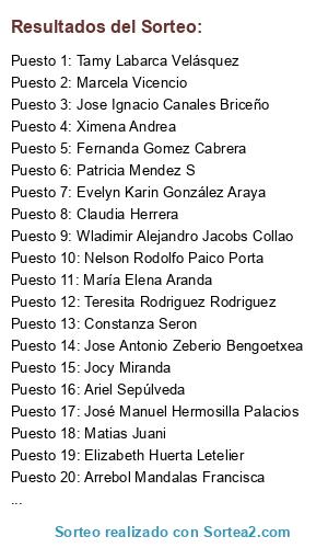 Lista de participantes: Jose Ignacio Canales Briceño(28 participaciones), Marlenne Ayala Novoa, Teresita Rodriguez Rodriguez, José Manuel Hermosilla Palacios(2 participaciones), Claudia Herrera, Bella Ropa, Fernanda Gomez Cabrera(4 participaciones), Ximena Andrea, Carolina Pantoja Carrasco, Marco Antonio Ayala Ayala, Yovana Placencia Pardo, Maria Ysabel Aravena Sayes, Isabel Soledad Sainz Lopez(2 participaciones), Criadero Trikavan, Eliih Barraza Artigas, Knelo Leon(2 participaciones), Pablo Terraza, Evelyn Karin González Araya(2 participaciones), Patricia Dosque(2 participaciones), Tamy Labarca Velásquez, Carol Tapia Arevalo, Marcela Vicencio, Paola Cerda Molineiro(2 participaciones), Elizabeth Huerta Letelier, Cecilia Rojas C, Sergio Claudio Ghio, Matias Juani, María Teresa Escobar(3 participaciones), Ariel Sepúlveda, Claudia Flores Montecinos, Arrebol Mandalas Francisca(3 participaciones), Aaron V. Bugueño, Joaquín Donoso Araya, Jocy Miranda, Patricia Mendez S(3 participaciones), Wladimir Alejandro Jacobs Collao, Catalina Céspedes Jara, María Elena Aranda, Andres Pedraza Vasquez, Bryan Johnson, Catalina Farías Zúñiga, Lily Nubes, Jose Antonio Zeberio Bengoetxea, Constanza Seron(8 participaciones), Nelson Rodolfo Paico Porta, Manolo Camina Solo, Carito Belmar, Sonia Calderon Nuñez.