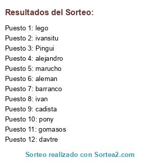 Lista de participantes: cadista, lego, marucho, ivan, alejandro, pony, gomasos, ivansitu, aleman, Pingui, davtre, barranco.