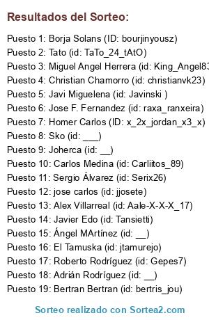 Lista de participantes: jose carlos (id: jjosete), Carlos Medina (id: Carliitos_89), Jose F. Fernandez (id: raxa_ranxeira), Roberto Rodríguez (id: Gepes7), Tato (id: TaTo_24_tAtO), El Tamuska (id: jtamurejo), Alex Villarreal (id: Aale-X-X-X_17), Javier Edo (id: Tansietti), Christian Chamorro (id: christianvk23), Bertran Bertran (id: bertris_jou), Miguel Angel Herrera (id: King_Angel8329), Javi Miguelena (id: Javinski ), Sergio Álvarez (id: Serix26), Borja Solans (ID: bourjinyousz), Homer Carlos (ID: x_2x_jordan_x3_x), Ángel MArtínez (id: __), Adrián Rodríguez (id: __), Joherca (id: __), Sko (id: ___).