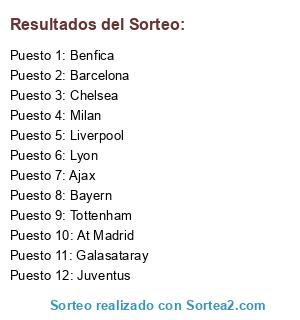 Lista de participantes: Milan, Juventus, Barcelona, Bayern, Chelsea, Liverpool, At Madrid, Tottenham, Lyon, Galasataray, Benfica, Ajax.