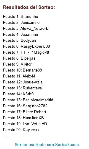 Lista de participantes: Fer_vivaelmadrid, Quini13, Rubenteve, Jonicanino, Joaannnn, F1src-Robert, Bernalte88, Bodycan, Aleiva_Network, RaspyExpert008, Aleix44, CN-C4t4, Rubargggnbdomaio, Lvo_VettelHD, Braiisinho, HamiltonXB, Josue-Vzla, K3rb0_, Peryco, Serginho2782, Vikitor, Kayserxx, Elpelijas, FTT-F1Magic-ftt.