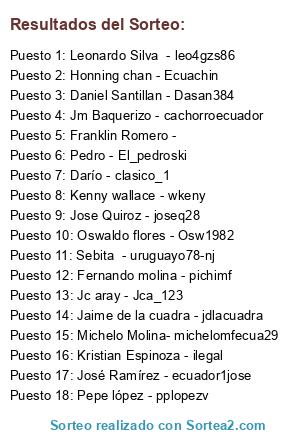 Lista de participantes: Kristian Espinoza - ilegal, Jc aray - Jca_123, Jose Quiroz - joseq28, Pedro - El_pedroski, Daniel Santillan - Dasan384, Oswaldo flores - Osw1982, Michelo Molina- michelomfecua29, Sebita - uruguayo78-nj, Pepe lópez - pplopezv, José Ramírez - ecuador1jose, Jaime de la cuadra - jdlacuadra, Jm Baquerizo - cachorroecuador, Honning chan - Ecuachin, Leonardo Silva - leo4gzs86, Darío - clasico_1, Kenny wallace - wkeny, Fernando molina - pichimf, Franklin Romero -.