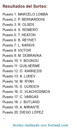 Lista de participantes: A. LUNEV, M. DÚBRAVKA, C. VARGAS, Y. BOUNOU, MARCELO LOMBA, O. KARNEZIS, A. MIRANTE, B. REYNET, M. SPORTIELLO, DAVID SORIA, B. FOSTER, TIAGO VOLPI, MOYÀ, I. KHUNE, GUILHERME, T. HEATON, S. ROMERO, MARCELO GROHE, S. ULREICH, L. KARIUS, M. GÜNOK, P. BERNARDONI, A. LAFONT, VICTOR, O. VLACHODIMOS, E. MENDY, M. CAMPAÑA, DIEGO LÓPEZ, J. BUTLAND, M. RYAN, R. OLSEN, G. ARIAS.