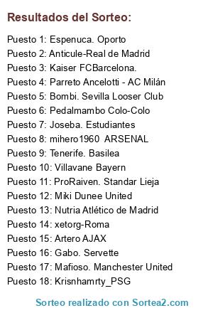 Lista de participantes: xetorg-Roma, Anticule-Real de Madrid, Parreto Ancelotti - AC Milán, Pedalmambo Colo-Colo, Kaiser FCBarcelona., Krisnhamrty_PSG, Villavane Bayern, Artero AJAX, Tenerife. Basilea, Mafioso. Manchester United, mihero1960 ARSENAL, Nutria Atlético de Madrid, Gabo. Servette, Joseba. Estudiantes, Miki Dunee United, ProRaiven. Standar Lieja, Bombi. Sevilla Looser Club, Espenuca. Oporto.