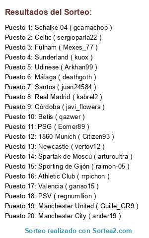 Lista de participantes: Athletic Club ( rrpichon ), Valencia ( ganso15 ), Sporting de Gijón ( raimon-05 ), Udinese ( Arkhan99 ), Córdoba ( javi_flowers ), Manchester City ( ander19 ), Betis ( qazwer ), Celtic ( sergioparla22 ), PSG ( Eomer89 ), 1860 Munich ( Citizen93 ), Spartak de Moscú ( arturoultra ), Newcastle ( vertov12 ), Real Madrid ( kabrel2 ), Sunderland ( kuox ), Fulham ( Mexes_77 ), Manchester United ( Guille_GR9 ), Santos ( juan24584 ), Schalke 04 ( gcamachop ), PSV ( regnumllion ), Málaga ( deathgoth ).