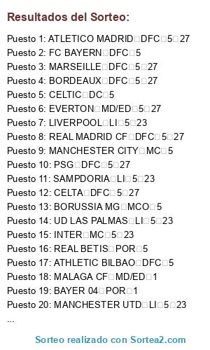 Lista de participantes: REAL BETIS POR 5, AC MILAN LI 5 23, MARSEILLE DFC 5 27, EVERTON MD/ED 5 27, CELTIC DC 5, CELTA DFC 5 27, LIVERPOOL LI 5 23, MALAGA CF MD/ED 1, ATLETICO MADRID DFC 5 27, REAL MADRID CF DFC 5 27, BORDEAUX DFC 5 27, AS ROMA MC 5, MANCHESTER UTD LI 5 23, OLYMPIQUE LYON DFC 5, UD LAS PALMAS LI 5 23, BORUSSIA MG MCO 5, BAYER 04 POR 1, ATHLETIC BILBAO DFC 5, PSG DFC 5 27, INTER MC 5 23, SAMPDORIA LI 5 23, OLYMPIAKOS MD/ED 5, MANCHESTER CITY MC 5, FC BAYERN DFC 5.