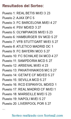 Lista de participantes: LIVERPOOL POR 5 27, NEWCASTLE UTD MD/ED 3, ARSENAL MI/EI 4 23, SPORTING CP POR 5 27, FC SCHALKE 04 MCD 4 27, NAPOLI MI/EI 5 27, OLYMPIAKOS MI/EI 5 23, GALATASARAY POR 5 27, AJAX DFC 5, FC BARCELONA MI/EI 4 27, VILLARREAL CF MI/EI 3 23, MANCHESTER UTD MI/EI 3 23, GETAFE CF MD/ED 5 27, VALENCIA CF MCO 3 23, REAL MADRID CF MI/EI 1, PANATHINAIKOS MC 5 27, MANCHESTER CITY MI/EI 3 23, FC BAYERN MCO 5 27, MARSEILLE MI/EI 5 23, BORDEAUX MI/EI 5 23, AS ROMA LI 1, AT. OSASUNA POR 5 27, BOR. DORTMUND LI 3 23, PSV MD/ED 3 27, HAMBURGER SV MCD 5 27, SEVILLA MCD 5 27, REAL BETIS MI/EI 3 23, ATLETICO MADRID DC 1, VFB STUTTGART MI/EI 5 27, RAYO VALLECANO POR 1, SPURS DFC 4 27, RCD ESPANYOL MD/ED 1, SAMPDORIA MCD 5 27.