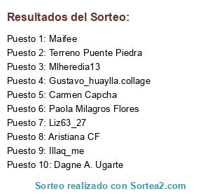Lista de participantes: Maifee, Mercedeszeg, Gabi.dlrf, Illaq_me, Cristian_heredia, Luz.d.falcon.1, Dezeroamas, Popopuccini, Oscarf0405, Koskofoods, Gustavo_huaylla.collage, Veronica Tirado, Rocio CR, Ruth Ugarte, Nicolas Lozano, Edith Beltrán, César Calderón, Susan FFonseca, Xecuca SMS, Karina Pacco, Ana López Puma, Isabella Uribe Rey, Doris Obando de Paredes, Lucía Mongradón Hernández, Dagne A. Ugarte, Sofy sofy, Francisco Pillaca, Paola Tejo, Isabel Barrientos, Shirley Rivera, Carmen Capcha, Gabriela LipM, Anaju Yen Timpio, Terreno Puente Piedra, Paola Milagros Flores, Marco Antonio PS, Laura Pillaca Saez, María Teresa Vargas, Sheila Ayala, Dina Felix Corrales, Clara Silva Sanchez, Aristiana CF, Liz63_27, Mlheredia13.