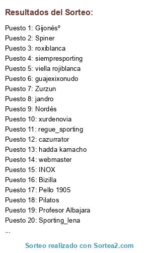 Lista de participantes: AdminPS, Arrancatapinos, ATÍPICU, Bizilla, Castro22, cazurrator, chipi, Eurosporting, everio lugones, fondosur, Gijonésº, guajexixonudo, hadda kamacho, INOX, jandro, jjesu, MaNu, neox, Nordés, Pello 1905, Pilatos, proevolutiongijon, Profesor Albajara, regue_sporting, roxiblanca, seisuefas, siempresporting, slash_ast, Sören, Spiner, Sporting_lena, Suso, Tarry, Vamos Sporting!, viella rojiblanca, webmaster, xurdenovia, yarguras, Zelig, Zurzun.