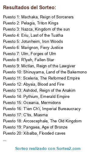 Lista de participantes: Arcoscephale, The Old Kingdom, Sceleria, The Reformed Empire, Pythium, Emerald Empire, Man, Tower of Avalon, Eriu, Last of the Tuatha, Ulm, Forges of Ulm, Marignon, Fiery Justice, Mictlan, Reign of the Lawgiver, T'ien Ch'i, Imperial Bureaucracy, Machaka, Reign of Sorcerers, Agartha, Golem Cult, Abysia, Blood and Fire, Caelum, Reign of the Seraphim, C'tis, Miasma, Pangaea, Age of Bronze, Asphodel, Carrion Woods, Vanheim, Arrival of Man, Jotunheim, Iron Woods, Vanarus, Land of the Chuds, Bandar Log, Land of the Apes, Shinuyama, Land of the Bakemono, Ashdod, Reign of the Anakim, Nazca, Kingdom of the sun, Xibalba, Flooded caves, Atlantis, Kings of the Deep, R'lyeh, Fallen Star, Pelagia, Triton Kings, Oceania, Mermidons.