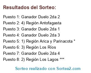 Lista de participantes: 1) Región Arica y Parinacota *, 2) Región Los Lagos ***, 3) Región Los Ríos, 4) Región Antofagasta, Ganador Duelo 2da 1, Ganador Duelo 2da 2, Ganador Duelo 2da 3, Ganador Duelo 2da 4.