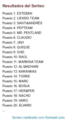 Lista de participantes: KARANKAS, HER&PER, NACHO, LIENDO TEAM, ÁLVARO, MR. PENTLAND, RAÚL, SANTI&ANDRÉS, ESTEBAN, AL MADHARI, TORRE, JAVI, GHD, EDU, JON, VARO, MARC, CLAUDIO, PEPTEAM, BORJA, MARKINA TEAM, QUIQUE.
