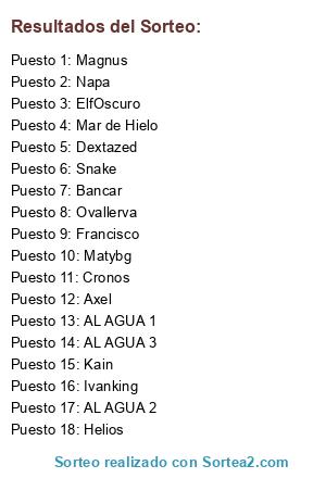 Lista de participantes: Napa, Magnus, Dextazed, Francisco, Matybg, Axel, Bancar, Cronos, ElfOscuro, Ivanking, Ovallerva, Helios, Kain, Mar de Hielo, Snake, AL AGUA 1, AL AGUA 2, AL AGUA 3.