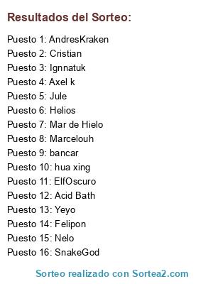Lista de participantes: SnakeGod, Mar de Hielo, Helios, AndresKraken, Yeyo, Cristian, ElfOscuro, Marcelouh, Nelo, Acid Bath, Jule, Axel k, hua xing, Felipon, bancar, Ignnatuk.