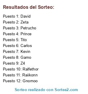 Lista de participantes: Gamo, Raiikonn, Ralfethor, Petrucho, Carlos, David, Tito, Prince, Gnomoo, Zeta, Z4, Kevin.
