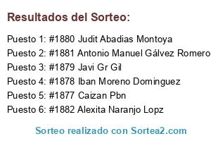 Lista de participantes: #1799 Ivan Calderon, #1800 Javi Maroto, #1801 Seba Martinez, #1802 Javier Esteban Cantarero, #1803 Alberto Sanjuan Llanso, #1804 Kike Pino, #1805 Juan Carlos Moro, #1806 Ivo Ivaylov, #1807 Pedro Barbosa, #1808 Adrian Rodriguez, #1809 Samuel Gonzalez Garcia, #1810 Andrésin Sin Sin, #1811 Vicente Plaza Franco, #1812 Antonio Ruiz Amate, #1813 Ivan Espinosa Lacarcel, #1814 Sergio Candela, #1817 Luis Cabrerizo Guzmán, #1818 Isaac Gavilan Gavira, #1819 Javi Gomez, #1820 Carlos De La Morena, #1821 Francisco Sánchez, #1823 Carlos Sanjuán Llansó, #1824 Miguel Gomes, #1825 Miguel Montagud, #1826 Raúl Méndez Rodríguez, #1827 Toni Nox, #1828 Jona Pdm, #1830 Cristian Baño Belchí, #1831 Francisco Jose Dpg, #1832 Hector Herrera Velazquez, #1833 Nacho Rubio, #1834 Jose David Delgado, #1836 Noe Cheli, #1837 Marta Ruiz, #1838 Toni Escamilla Pardo, #1839 Raquel Moli, #1840 Jon Santos Martin, #1841 Crissy Santos, #1842 Johan Sebastian Estrada, #1843 J-Andrés DiBra, #1844 Antonio Garrido Torrano, #1845 Daniel Arroyo, #1846 Lydia Witherspoon, #1847 Julio Marhuenda Sanchiz, #1848 Ruben G. Perez, #1849 Michel Magnasco, #1850 Pedro José Valdearcos, #1851 Sami Cuca, #1852 Nano Gauna, #1853 Martín Pie, #1854 Luis Bustamante Rivera, #1855 Pablo Segon, #1856 Jordi Vall Llovera, #1857 Sandra Figuera, #1858 Pablo Azcona Calzado, #1859 Noelia Martínez, #1860 Raul Torrijos, #1861 Ismael Osorio Pajuelo, #1862 Josue Fortis, #1864 Rafael M. González, #1868 Juan Antonio Becerra, #1870 Alberto CM, #1871 Fer Camarillo, #1874 Alfonso Herrera, #1875 Raul Ruiz, #1876 Bebezota Mardomingo, #1877 Caizan Pbn, #1878 Iban Moreno Dominguez, #1879 Javi Gr Gil, #1880 Judit Abadias Montoya, #1881 Antonio Manuel Gálvez Romero, #1882 Alexita Naranjo Lopz, #1884 Vlad Timakov, #1885 Manel Alvarez Marsal, #1886 Mario Andrades Moreno, #1887 Mariu López, #1888 Miyagui Sánchez, #1889 David Torres Blanco, #1890 Erick Michelle Betancourt, #1891 Jose M Sanchez M, #1892 Ruben Villar Duran, #1893 Antonio Pajaro Loco, #1894 Guillermo Jose Manzanares Navarro, #1897 Pedro Garcia Dorrego, #1898 Olga Chacon Moreno, #1900 Daniel Antonio Ardela Jiménez, #1901 Sheila Marín Meroño, #1902 Cecilia Vizcaíno Bellón, #1903 Agustina Tiseyra, #1905 Victor Tejerina Serrate, #1906 Los Ratones De VillaRuinosa, #1907 Elena Martinez, #1908 Manuel García-Mauriño, #1909 Samuel Guty, #1910 Brahimito Ouajich, #1911 Sergi OA, #1912 Antonio Polvorinos Díaz, #1913 Miguel Minguez Perpiñan, #1914 Dani del Aguila, #1915 Jordi Biosca, #1916 Justo Escurís Ramallo, #1918 Eliiseo Creizsock Sanchez, #1920 Javi Salinas, #1921 Javi Salinasa, #1923 Minerva Martinez Vasalo.