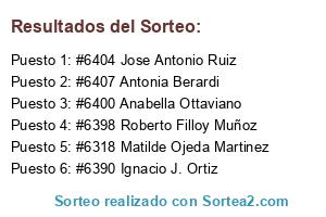 Lista de participantes: #6318 Matilde Ojeda Martinez, #6322 Mari Crespo, #6330 Mabel Paterno, #6337 Liliana Blanck Caruso, #6345 Diego León León, #6350 Emanuel Favretto, #6355 Nicolas Cuocina, #6358 Juanfeo Feojj, #6361 Alsan Chez, #6364 Marcelo Caffarel, #6366 Maria Veronica Gallardo, #6367 Pedro Garnung Aybar, #6371 Natalia Reggiani, #6378 Natalia Pistone, #6379 Graciela Dipasquale, #6380 Agustin Poma, #6383 Sara Vargas Castillo, #6385 Andrea Bonfanti, #6390 Ignacio J. Ortiz, #6398 Roberto Filloy Muñoz, #6400 Anabella Ottaviano, #6404 Jose Antonio Ruiz, #6407 Antonia Berardi, #6410 Daniel Saldaña Pariente, #6443 Roo Giorgini, #6448 Joan Joan, #6453 Maribel Godoy Martinez, #6457 Liliana Piccinetti, #6465 Nadia Stuer, #6467 Isabel Ramos Perez, #6470 Sabry Feria LP, #6479 Isabel Pregúnta Nadamas, #6485 Ana Martínez.
