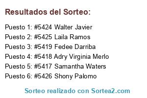 Lista de participantes: #4894 Rustico Ydemas, #4896 Gerardo Blicharski, #4897 Pablo Vega, #4898 Anita Con Eso Basta, #4900 Nicolas Ramallo, #4901 Adrian de Boedo, #4902 Gonza Robledo, #4903 Vicky Barragán, #4905 Laa Chechu, #4907 Francisco Sánchez, #4909 Juanny Escobar, #4910 Nicolas El Ranzio Minoliti, #4912 Alejandro Gilmour Espindola, #4915 Matias Ask, #4916 Gabriel Mercuri, #4917 Ripa Zorsillega, #4918 William Tevez, #4923 Damian Juarez, #4924 Noemi Alvarez Fdez, #4925 Chinoite Chaino, #4928 Juan Zárate, #4930 Gustavo Alfredo Carmagnola, #4931 Rancho Fantasma, #4932 Johanna Aranda, #4934 Hernan Nicolas Elias, #4935 Martín Gómez, #4937 Nachoo Gazaba, #4939 Rodrigo Fabian Chazarreta, #4940 Gonzalo Bogado, #4941 Juan Pablo Montes, #4943 Pablo Castro, #4944 Andrea Acosta, #4947 Lauro Lara, #4948 Misa Soria, #4949 Axel Adriel Falavigna, #4950 Guillermo Alejandro Lpg, #4951 Alejandro Gac, #4954 Marcela Ruiz, #4956 Pedro Garnung Aybar, #4959 Javy Breit, #4960 Pablo Dakius, #4963 Florencia Niilus, #4969 Gonzalo Acosta, #4982 Lydia Witherspoon, #4993 Nicolas Iazzetta, #4994 Ariel Olmos, #4998 Juan Ignacio Aschura, #4999 Cristian Valenti, #5001 Franco Daniel Lopez, #5002 Jose Mendoza, #5003 Anael Alexander Arevalo, #5004 Lucas Martin Baj, #5007 Dario Ramirez, #5015 Miguel A. Montilla, #5018 Guillermo Rosado Salido, #5022 Mauro Ivan Rojas Barchuk, #5031 Silvia Ariza, #5039 Damian Gagetti, #5041 Matti Pastore, #5044 Doña Aime Salcedo Della Carne, #5046 Caro Valacco, #5049 Lidia Estela Liveikis, #5050 Sebastian Ardiles, #5055 Fefo Gaitan, #5056 Graciela Valdéz, #5064 Mario Ariel Vitorgan, #5066 Iván Arduca, #5067 Sebastián Luque, #5068 Aguss Spick, #5069 Wladimir Sanczuk, #5073 Emiitoo Hackers, #5075 Martin Zetta, #5076 Gimena Petulla, #5079 Cynthia Diaz, #5080 Oman Lerados, #5081 Jorge Llamosas, #5084 Codigos De Barra, #5086 Guillermo Jose Manzanares Navarro, #5087 Silvia Andrea, #5089 Dmt Remeras, #5092 Raven Heart, #5094 Amadeo Furlanich, #5095 Silvia Cosci, #5096 Lautaro Gonzalez, #5099 Rodrigo Torchia, #5100 Alejandro Carmona, #5101 Miriam Andreoli de Ower, #5102 Ricky Flema, #5115 Tato Lago, #5117 Fede Santori, #5119 X Siempre Ian Yair, #5121 Raquel Wroblewski, #5125 Roque Rios, #5127 Ignacio Pup, #5131 Gonzalo Quiroz, #5135 Children CobHc, #5136 Alexis Otazo, #5139 Charlos Revolver, #5141 Andrès Amicone, #5145 Romina Avalos, #5147 Florencia Gaddi, #5148 Jorgelina Laura Mazzeo, #5149 Martin Miranda, #5150 Pablo Ribero, #5154 Mary Vk, #5155 Lorenzo Eri Segura, #5157 Gabytto Calleja, #5159 Miguel Robres.