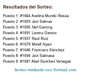Lista de participantes: #1646 Francisco Sánchez, #1657 Raul Ruiz, #1664 Avelina Mundo Rosaa, #1679 Miriell Nyan, #1681 Abel Sanchez Venegas, #1691 Lorenz Genios, #1693 Javi Salinas, #1694 Javi Salinasa, #1695 Nef Gaming.