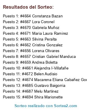 Lista de participantes: #3746 Mario Arevalo, #3747 Laura Garcia, #3748 Gladys Cornier, #3749 Cielito Lindo, #3750 Rayén Castro, #3753 Marcelo Alfaro, #3754 Gerardo Luis Polischuk, #3756 Polli Newells, #3758 Gabi Machain, #3761 Ani Brito, #3762 Bernardita Agodino, #3764 Federico Bertero, #3765 Sofi Marioli, #3766 Romina Tamame, #3767 Julio Aliciardi, #3770 Naacho Diaz Otañez, #3780 Marita Manfredi, #3781 Daniela Peysere Fenocchi, #3782 Mercedes Gomez Gomez, #3786 Mariano Seen, #3788 Hector Luis Capogrossi, #3789 Moni Monse, #3791 Andrea Martin, #3793 Gabriela Andrea Luengo Henriquez, #3800 Obdulia Martín, #3802 Marcos Paez, #3803 Analía Alejandra Güizzo, #3814 Vir Machain, #3815 Lisandro Machain, #3816 Alicia Perez, #3817 Lorena Seib, #3821 Ale Molina, #3823 Monica A. Villarruel, #3826 Claudia Szahan, #3827 Teresa Salvador, #3830 Maria Isabel Tabernero, #3832 Carolina Casas, #3833 Lina Sosa, #3836 Alonzo Naah, #3840 Acosta Andy, #3842 Tatiana Bblh, #3843 Graciela Dipasquale, #3844 Ana Bronchal, #3848 Florencia Gimena Gómez, #3858 Nicolas El Ranzio Minoliti, #3860 Pattri Rodrigues, #3872 Andrea Di Doi, #3884 Celi Sosa Luna, #3896 Tierra Sea, #3921 Marta Alonso, #3933 Oscar Adolfo Martinez, #3949 Claudia Sol, #3955 Olimpia Upss, #3966 Raul Ruiz, #4009 Luciano Urquiza, #4043 Rober Acosta, #4048 Kali Jabones Kali, #4072 Maribel Godoy Martinez, #4074 Maria L Schneider, #4098 Marina Pérez Ordóñez, #4103 Virtudes Valdés Estevan, #4105 Jorge Muñoz, #4109 Maria Susana Musso, #4119 Ainhoa Morales, #4122 Gaby Rovira Peluquera, #4132 Raquel Martínez, #4134 Lorenita Olmo, #4139 Gustavo Alberto Civarolo, #4154 Sandra Chachu Herrera, #4156 Compravent Oeste A, #4157 Rodrigo Damian Pertuso, #4167 Caro Chialva, #4168 Fanny Brito Lettier, #4173 Hellokiitty Animalwebhk, #4191 Juli Mello, #4212 Jesus Ryuuzaki, #4225 Roxana Carrasay, #4226 Fabián Soler, #4234 M Amparo Frasquet, #4240 Gustavo Bas, #4265 Guadalupe Velazquez, #4309 Alvaro Guijarro, #4320 Sofi Vega, #4321 David Carabajal, #4326 Maru Guzman Musso, #4331 Ana Ortega Camps, #4335 Fedee Soler, #4338 Ivan Jimenez Diaz, #4344 Cristian Fabián Soler, #4345 Micaela Rolon, #4359 Brian Dinamo, #4363 Felix Lopez O̲̲̅̅f̲̲̅̅i̲̲̅̅c̲̲̅̅i̲̲̅̅a̲̲̅̅l̲̲̅̅'̲̲̅̅F̲̲̅̅b̲̲̅̅, #4365 Sofi Balcaza, #4369 Rocío Sierra, #4370 Janire Igoa Merino, #4374 Maca Costa, #4382 Shamyla Peluquera Farias, #4396 Sara Corzo, #4398 Maria Lujan Martinez, #4408 Edu Narux Pons, #4418 María Belén Rita, #4433 Santii Nahuel, #4446 Laia Romera Macias, #4447 Calina Lizarraga, #4470 Mario Ariel Vitorgan, #4518 Raquel Dqd, #4522 Maria Loreto Carrasco, #4560 Belen Noriega, #4562 Jorge Aguilera, #4607 Alejandra Pirotto, #4616 Shey Alonso, #4618 Claudia Elizabeth Gomez, #4622 Lukita Dvm, #4640 Paula Delgado Güimil, #4655 Miriam Moyano Castillejo, #4656 Lorena Olivares, #4657 Cristian Gabriel Manduca, #4659 Andrea Boletta, #4661 Alejandra I-Villafañe, #4662 Cristina Gonzalez, #4663 Silvina Peralta, #4664 Constanza Bazan, #4667 Lora Coronel, #4670 Gabriela Muñoz, #4671 Maria Laura Ramirez, #4672 Belen Audisio, #4674 Macarena Eliana Cabañez Godoy, #4675 Mario González Aguilar, #4679 Fran Vega, #4680 Mariana Muñoz, #4683 Romina Paez, #4684 Victoria Bas, #4685 Gustavo Baigorria, #4687 Melu Martinez, #4694 Shira Marionette, #4701 Yanina Camusso, #4703 Daia Iustina, #4716 Titi Titeuf, #4718 Stella Fernandez, #4719 Cata Venosta, #4720 Mariela Vivas, #4721 Daniel Alejandro Lues, #4722 Diego Sens, #4723 Alberto Oliva, #4724 Berenice Reyes, #4726 Tania Bueno Gijón, #4749 Cristian Fernando Dudulec, #4750 Silvia Estela Lazarte, #4772 Pepito Medina Laso, #4775 Mati Lucero, #4776 Fernando Carande, #4777 Fer Mercado, #4779 Naty Sariago, #4784 Marcela Arri, #4785 María Isabel Ramos, #4787 Maria Romera, #4788 Nazareno Albarracin, #4790 Ana Morandi, #4791 Ana Gandolfo, #4792 Lau Quinteros, #4793 Mónica Magda, #4795 Gisel Edith Bolner, #4796 Alejandra Fotin, #4798 Ali Santucho, #4799 Vanessa Eberle, #4800 Daniel Gaspari, #4801 Antonella Bosio, #4802 Martha Zarzur, #4803 Claudia Cancino, #4804 Lucía Fedinich, #4805 Cristhian Machado, #4806 Guada Romero, #4807 Viviana Scotto, #4808 Jose Ignacio Cachaperin Mate, #4809 Mauricio Gili, #4810 Facu Casas, #4811 Daniel Antonio Cotoras, #4812 Sarai Maz, #4815 Ana Luz Muñoz Izquierdo, #4816 Edith Bertolotto, #4817 Noe Paradela, #4818 Biblioteca Golondrina, #4821 Francisco Fernandez Moraño, #4822 Andrea Coria, #4823 Maria Carrasay, #4824 Flor Las Heras A., #4825 Hugo Vega.