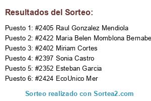 Lista de participantes: #2352 Esteban Garcia, #2354 Maria Rosa Abate, #2355 Roser Mata, #2357 Cristina Obregon, #2367 Claudia Sol, #2371 Jorge Fernandez Defoin, #2379 Lydia Witherspoon, #2381 Francisco Sánchez, #2383 Ivan Galvez Marfil, #2386 Raul Ruiz, #2391 Sara Cameo Apilluelo, #2394 Mariana Russo, #2395 Mariela Mansilla, #2396 Luciana Criado, #2397 Sonia Castro, #2402 Miriam Cortes, #2405 Raul Gonzalez Mendiola, #2422 Maria Belen Momblona Bernabe, #2424 EcoUnico Mer, #2434 Rosario GT, #2435 Lydia Alarcón Llamas, #2440 Maria Pagano, #2445 Cristina Martinez Meca, #2461 Sabrina Loureiro Ferraces, #2463 Manuela Rodriguez, #2465 Maria Tabares Espada, #2470 Inma Santos Suarez.