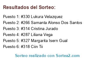 Lista de participantes: #266 Samanta Alonso Dos Santos, #287 Liliana Vega, #288 Aquilino Arellano, #296 Raul Ruiz, #314 Cristina Jurado, #318 Ciin Tii, #325 Jesica Neira, #327 Margarita Isern Gual, #330 Lukura Velazquez, #334 Prisci Lindisima.