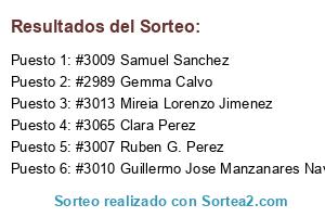 Lista de participantes: #2989 Gemma Calvo, #2990 Marta Morales López, #2991 Sandra Alonso Flórez, #2995 Ana Bermudez Pelaez, #3001 Vanessa Mikel, #3004 Carlos Masterchef Junior, #3007 Ruben G. Perez, #3009 Samuel Sanchez, #3010 Guillermo Jose Manzanares Navarro, #3012 Lydia Witherspoon, #3013 Mireia Lorenzo Jimenez, #3017 Ale Mateo Aguilar, #3026 Raul Ruiz, #3055 Veronica Fernandez Petisco, #3065 Clara Perez, #3068 Lorenita Olmo, #3071 Lolytta Ideas.