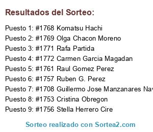 Lista de participantes: #1708 Guillermo Jose Manzanares Navarro, #1709 Jenny Perez, @m.gartri, #1711 Marco Lorenzo, #1712 Pedro Jurado, #1713 Miguel Angel, #1714 Mark Mesa, @aleluque, @makiheavy1977.mc, @jorgeshistoria, @llamarada7, @sikander22, @maki_heavy, #1721 María Galvan, #1722 Fabrice Bastian, #1725 Sofi Paez, #1727 Belen Candy, #1728 Rosario GT, #1730 Gustavo Bregon Puerta, #1734 Francisco Sánchez, #1736 Lorenita Olmo, #1737 Ainhoa Morales, #1744 Núria Pilar Cervera Cid, #1749 Francisco Javier Martinez Romero, #1753 Cristina Obregon, #1756 Stella Herrero Cire, #1757 Ruben G. Perez, #1761 Raul Gomez Perez, #1768 Komatsu Hachi, #1769 Olga Chacon Moreno, #1771 Rafa Partida, #1772 Carmen Garcia Magadan, #1773 Cristina Martinez Meca, #1776 Vanilu Ba, #1777 Eva Caceres Mendoza, #1779 Pol Escolano, #1780 Raul Ruiz, #1786 Aria Rojas, #1787 Paula Oterino Conde, #1788 Alfonso Miguez, #1792 María T. Deschutter, #1797 Nahuel Trucido, #1798 ZpaTzerk SNy, #1835 Marta Ruiz, #1863 Jose Manuel Carretero Tato, #1865 Rafael M. González, #1873 Abimael Perez, #1883 Natalia Lanocci.