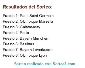 Lista de participantes: Olympique Marsella, Bayern Leverkusen, Besiktas, Olympique Lyon, Bayern Munchen, Paris Saint Germain, Galatasaray, Porto.