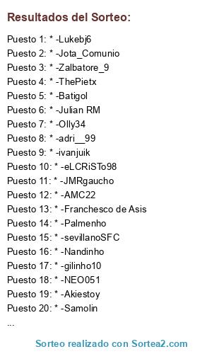 Lista de participantes: * -JMRgaucho, * -Zalbatore_9, * -Franchesco de Asis, * -Samolin, * -Julian RM, * -Palmenho, * -Nandinho, * -Jota_Comunio, * -Lukebj6, * -gulllivilly, * -ivanjuik, * -saviodios, * -j0rg1t0rZ, * -Akiestoy, * -gilinho10, * -N1N0-X, * -Batigol, * -ThePietx, * -AMC22, * -eLCRiSTo98, * -r_vercetti, * -Enchu, * -adri__99, * -NEO051, * -espartanocai, * -ervito, * -superuce, * -paislliones, * -sevillanoSFC, * -guille_isla, * -Olly34, * -Mata.