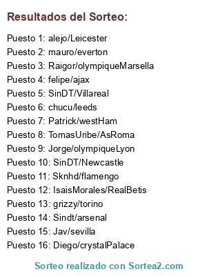 Lista de participantes: Jav/sevilla, alejo/Leicester, grizzy/torino, chucu/leeds, mauro/everton, felipe/ajax, Sknhd/flamengo, Raigor/olympiqueMarsella, Sindt/arsenal, Patrick/westHam, TomasUribe/AsRoma, IsaisMorales/RealBetis, SinDT/Villareal, Diego/crystalPalace, SinDT/Newcastle, Jorge/olympiqueLyon.