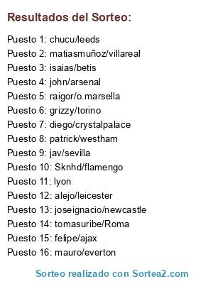Lista de participantes: john/arsenal, jav/sevilla, grizzy/torino, alejo/leicester, felipe/ajax, chucu/leeds, Sknhd/flamengo, matiasmuñoz/villareal, mauro/everton, joseignacio/newcastle, raigor/o.marsella, tomasuribe/Roma, isaias/betis, patrick/westham, lyon, diego/crystalpalace.