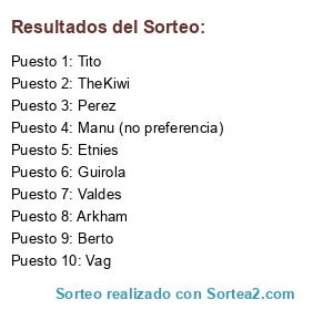 Lista de participantes: Valdes, Arkham, Etnies, Vag, TheKiwi, Perez, Guirola, Berto, Tito, Manu (no preferencia).
