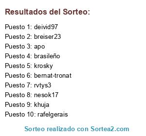 Lista de participantes: deivid97, nesok17, rvtys3, krosky, bernat-tronat, brasileño, apo, khuja, breiser23, rafelgerais.