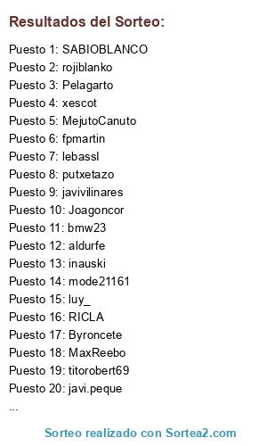 Lista de participantes: jorge_elche..., Pirlin, paco_ilicitano, RICLA, putxetazo, marcos06, bmw23, javivilinares, javi.peque, Byroncete, luy_, Real-Sociedad, opaalvaro, xescot, Joagoncor, lebassI, titorobert69, fpmartin, rojiblanko, LP_6, aldurfe, JLGS190373, inauski, SABIOBLANCO, mode21161, anakinskywalker, ninja19, MaxReebo, javilonn, ferucho, DeaLeR_78, stevemac, MejutoCanuto, ---zumbon, Pelagarto, alicante69.