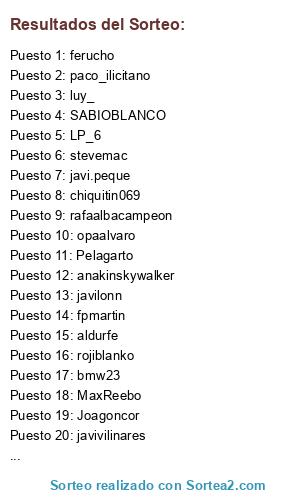 Lista de participantes: fpmartin, ninja19, lebassI, Pirlin, javilonn, RICLA, aldurfe, ferucho, Byroncete, javivilinares, inauski, titorobert69, Joagoncor, paco_ilicitano, opaalvaro, xescot, rafaalbacampeon, choses, alicante69, rojiblanko, luy_, LP_6, Osandie, bmw23, putxetazo, javi.peque, GOATID2, JOSCARGAR, marcos06, Real-Sociedad, DeaLeR_78, ---zumbon, MejutoCanuto, anakinskywalker, chiquitin069, Mikel-46, stevemac, JLGS190373, jorge_elche..., SABIOBLANCO, MaxReebo, Pelagarto.