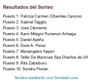 Lista de participantes: Doris A. Perez, Cecilia Rodriguez Castillo , Sandra Florian , Daniel Apeña , Alodia Reategui , Karin Liceth Zevallos Terrazas , Sandra Janampa , Karin Milagro Puriaman Arteaga, Patricia Carmen Cifuentes Cancino , Taller De Manicure Spa Diseños de Uñas , Julissa Bocanegra de Boza, Jose Clemente , Domy Uscamayta Campos , Mariangeles Yaipen , Rita Zabarburu , Jazmin Benavides Blas , Gabriel Tagglio , Jheyner Pitazzy.