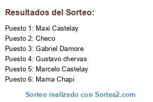 Lista de participantes: Axel Echevarria, Gustavo chervas, Gustavo chervas, Gustavo chervas, Gustavo chervas, Mada Ramirez, Gabriel Damore, Gabriel Damore, Julieta Damore, Brisa Damore, Nicolas Damore, Mada Papá, Maxi Castelay, Mama Chapi, Marcelo Castelay, Marcelo Castelay, Erica Silvestre, Erica Silvestre, Checo, Gabriel Albertizi, Maria Zarza, Guillermo Alem, Rosana Angeloni, Raquel Gise.