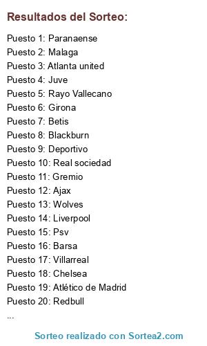 Lista de participantes: Liverpool, Malaga, Hamburgo, Napoles, Bilbao, Juve, Chelsea, Psv, Paranaense, Real sociedad, Betis, Celtic, Levante, Blackburn, Barsa, United, Inter, Girona, Newells, Rangers, Deportivo, kaizer chiefs, Gladbach, Psg, Villarreal, Atlanta united, Zaragoza, Wolves, Las palmas, Rayo Vallecano, Español, Redbull, schalke 04, Gremio, Sevilla, Bayern Múnich, Atlético de Madrid, Ajax, Cádiz, Man city.