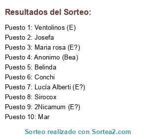 Lista de participantes: 1Lourdes, 2Nicamum (E?), 3*May (E), 4Catanya, 5Miss Potingues, 6Claudia , 7Ana Belen, 8Maribel (E?), 9Laky, 10Olga, 11Branca de Neve (E), 12Luna, 13Mayte R.M, 14Tessa, 15Mai V (E), 16Rospike (E), 17María*, 18Happy eyes, 19V de Vane (E), 20Montse, 21Fisiwoman, 22Betsabé(E?), 23Taronger (E?), 24Valeria, 25N.Poe (E?), 26Inma , 27Susu, 28Clio33, 29Emma , 30Amore, 31OlgaS, 32Zaida (E?), 33Bettie, 34Marisa, ag180 (E?), Mapachito (E?), Sonia Herrero (E), Miss Soler (E?), Paz (E?), Ziloilt (E?), Concursamania, Luna encaprichada (E), Chelo, Pittussia (E?), Cheeth Pink, Lourdes Arellano, Maria (E?), Rosita1, Irene , Nosotras..., Sirocox, Urraca (E), Gabu, Odaklesam (E?), Cucaracha, Mery, Siempremona, Gadirroja, Welzen, Nina1(E?), Pensée, Perlica84 (E?), Cristina (E?), María Aguyé (E?), Chispa, Make Up Nyna (E), lorena1(E?), Amigas Make Up, MDA, Mar, Isisabel, Honeylicius (E?), Yoisaljo (E?), Laura1(E?), Lucía Alberti (E?), Ar-Vel, Choco Chic, María Bueno Bouza (E?), Maria rosa (E?), Lucia, Elycor18, Victoria, Lourdes (lpm660), Maria Glez, Emmabv (E), Kyllie (E?), Bloody Rose (E), Eva (E?), La Reina Cotilla (E?) , Lorena2 (E?), Katerina (E?), Montanoa, Lush Adicta, In My Closet (E?), María angelica (E?), Sara , Mariant, Manuela (E?), Nia (E?), Silvia (E), Kalambaca, Carenas2009, MaryCarmen (MaryC) (E?), Moli, Sonia (E?), Ventolinos (E), Drissing (E?), Makoke5????, TatianaAlexia (E?), Esther (E?), Dafne Luna , Tete Valero (E?), La niña mariposa (E?), Lebasi, Sweetdie (E?), Quiromasaje38, U*, Saragonzalez3, Karmami, Maipevivi (E?), PerezAnuska, Auro11, Mjose (E?), Ani (E?), Dry Martini (E?), Marguar, Andrea, Anonimo (Bea), Laia (E?), Melania, Isaingenio, G.Brocante (E), Lucyboop (E), Alba(to chic or not to chic) (E?), Florencia (E?), Strange Quark (E?), Meryux, Alicia, Diana Maria Baeza (E), Antheami (E?), Anapere40 (E?), Maria Jesus (E?), Gondor Tari (E?), Cecilia (E), Kasumi, Elenitaperez, Mery (E?), Mari Cari (E?), Mireia, Anica (E?), Misela1970, Nuria, Anitta (E?), Miriam Gazquez (E?), Ruculaverde (E?), Esther, Conchi, Tupersonalshopperviajero, Cristina Ortiz (E?), Nina (E?), Josefa, Belinda, Chica, Laura2, No me mires, Palu, Deborah, Alicia Guerrero, Miss Thirty (E?), Patricia (E?).