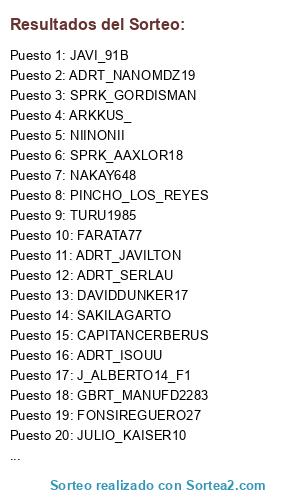 Lista de participantes: EDU0693, PINCHO_LOS_REYES, MF1_MINI_CRAZY, MF1_ASIER11CAN, ADRT_ISOUU, ADRT_TONIRC14, ADRT_SERLAU, JS_COYOTE, F1R_NAWER-GTLINE, SKZR_GABRI1128, MF1_JOSESTACK1, GS_PACOJONES, GBRT_MANUFD2283, XXJOANXX05, ADRT_A_AMADOR, ADRT_DBLACK, FFS_IS4AC, GS_ANGEL, ADRT_JOSEREYES, ADRT_JUANROJO, SERRANITO32, ADRT_MCQUEEN, FONSIREGUERO27, A_GOMEZ_72, JATIGI04, DANIRM999, SPD_QUIIMETT_, CCORPASP, AARONALV1507, SCO_TORRULLO, ADRT_ELRAUL, ADRT_ALONSO, SPRK_AAXLOR18, ALEXFERRE77, PIXAIAS99, IMBRUDIAZ, HASTALOSWEBOSJR, JAVI_91B, J_ALBERTO14_F1, ROBFCB92, SCO_KINGNOAH, SCO_SANDROLM, ADRIANBLANCO678, ADRIBG2000, ADRT_LITTELBILLY, ADRT_NANOMDZ19, CT_TOKO, LIL_FRAN, GBRT_COLOTTO, TURU1985, PELIZELLI, DANIRONI, JORDAN35GUILLE, GBRT_BONILLA_98, CNGRS_JAVIIQG24, ADRT_JAVILTON, ABECEIRO34, SPD_MRGAMERS, ER_MANUE88, JORGEGALLEGO27, SPRK_SAMUOLEA, SPRK_GORDISMAN, DAVIDDUNKER17, ANDER_GOROS7, MF1_THEBASSUR99, CALLEJAATLETI_98, MICHELTORRES1989, FARATA77, JLIXO, AJPEREZBETICO96, MF1_KINGTHEBOSS1, NIINONII, RAMON_NAVARRO25, JOAQUINTIN, GODZILLA, JR_MARTOS, PABLORC_85, JANDRES, LKF_REMOS, MUNILLA88, SCALVENTES, THEADRIATLETICO, NAKAY648, JULIO_KAISER10, SPRK_ELCHE76, ARKKUS_, RUBPERJU86, DAMARTOS, LANDER_SC, ELIASDC78, ELROPPER, GONZALOCH87, DYNAMBA, CAPITANCERBERUS, TITO_HIGUAIN, SAKILAGARTO, FRAN_MARESP, RUBENRACE17, HANSITIUS, MF1_PABLOGARFER9.