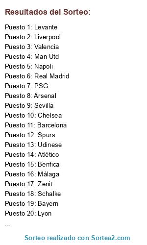 Lista de participantes: PSG, Barcelona, Schalke, Udinese, Sevilla, Man Utd, Real Madrid, Bayern, Napoli, Real Sociedad, Lyon, Spurs, Milan, Levante, Arsenal, Atlético, Benfica, Galatasaray, Valencia, Liverpool, Chelsea, Málaga, Zenit, Dortmund.