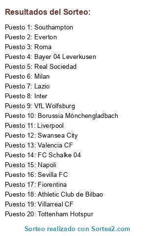 Lista de participantes: Southampton, Swansea City, Fiorentina, Everton, Borussia Mönchengladbach, Tottenham Hotspur, Real Sociedad, Milan, Bayer 04 Leverkusen, FC Schalke 04, Villarreal CF, Lazio, VfL Wolfsburg, Athletic Club de Bilbao, Napoli, Inter, Valencia CF, Sevilla FC, Liverpool, Roma.