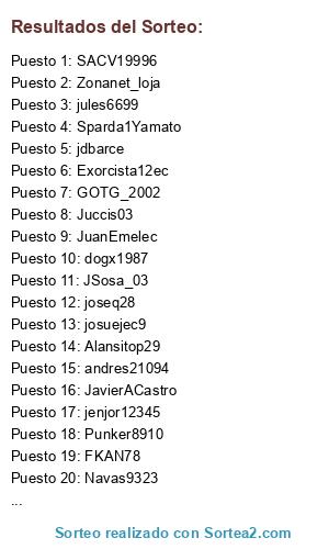Lista de participantes: edymonje_ec, FKAN78, JuanEmelec, luchi2301, Exorcista12ec, josuejec9, jenjor12345, andres21094, JavierACastro, Punker8910, SACV19996, dogx1987, joseq28, jules6699, Zuraandres, jdbarce, Sparda1Yamato, Zonanet_loja, GOTG_2002, JSosa_03, Ersigcha23, Navas9323, Alansitop29, Juccis03.