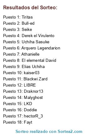Lista de participantes: kaiser03, Uchiha Sasuke, El elemental David, Doddie, Seike, Draknor13, Tiritas, LKD, Fayt, Elias Uchiha, Blackwi Zard, hectorR_3, Athanielle, Arquero Legendarion, Bull-ed, Malyghost, Derek el Virulento, LIBRE.